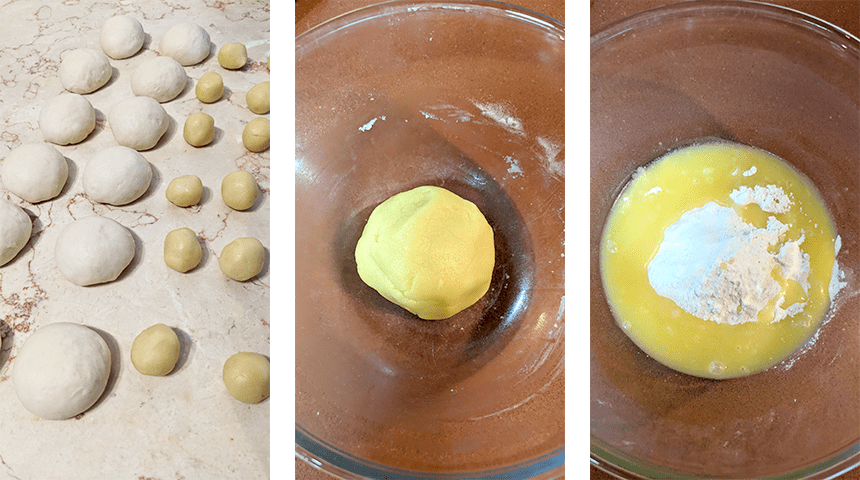 מחלקים את הבצק ואת בצק השומן ל-12 חלקים שווים ומכדררים לכדורים.