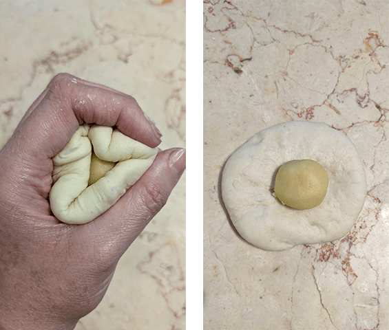 משטחים כדור בצק, מניחים במרכזו כדור בצק שומן וסוגרים את הבצק סביבו לכדור. מניחים בצד וחוזרים על הפעולה עם שאר הכדורים.
