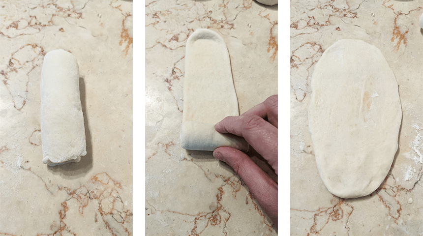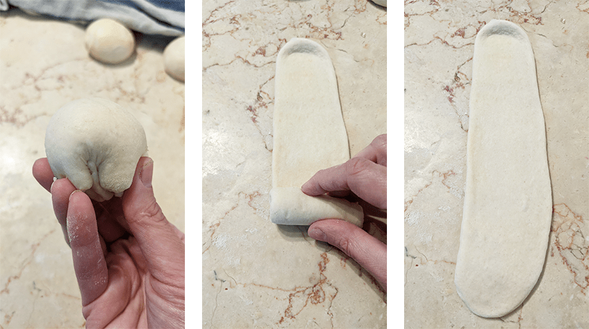 לוקחים את הכדור הראשון שהכנו, מרדדים לאליפסה בעובי 3-5 ס"מ. מגלגלים את האליפסה לגליל, מסובבים 90 מעלות, מרדדים ומגלגלים שנית לגליל. צובטים את הקצוות, מקפלים את הגליל לשניים, יוצרים כדור ומניחים על משטח מקומח. חוזרים על הפעולה עם שאר הכדורים, מכסים ומניחים ל-10 דקות.