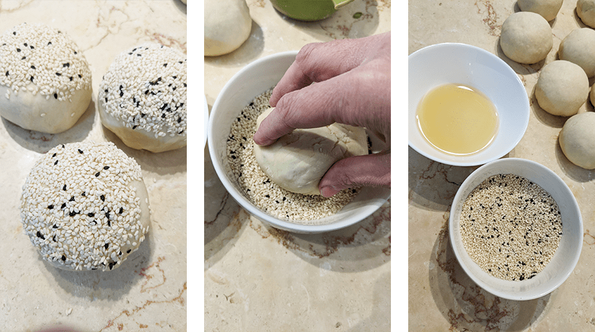 מברישים את פני הלחמניות במי הדבש בעזרת מברשת אפייה, טובלים בקערה עם השומשום ומניחים ברווחים על תבנית מרופדת בנייר אפייה כשהחלק עם השומשום פונה כלפי מעלה.