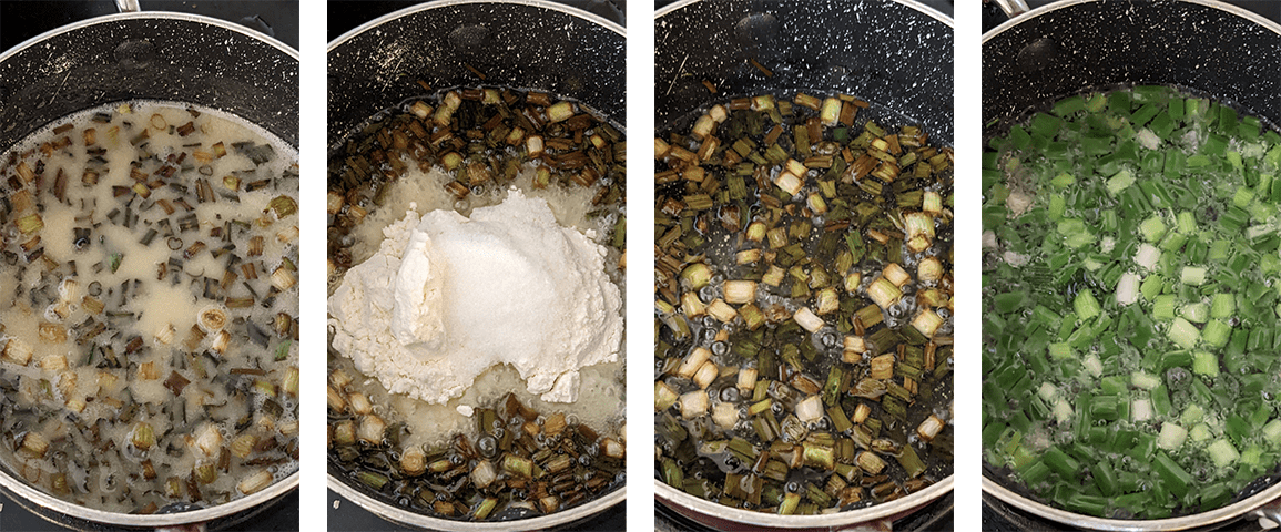 מכינים את תערובת השמן למריחה – קוצצים בצל ירוק. מחממים שמן בסיר קטן, מוסיפים את הבצל הירוק ומטגנים על אש בינונית עד להשחמה. מורידים את הסיר מהאש ומוסיפים מלח וקמח, מערבבים לרביכה אחידה ומניחים בצד.