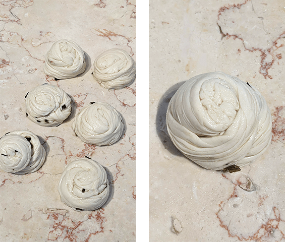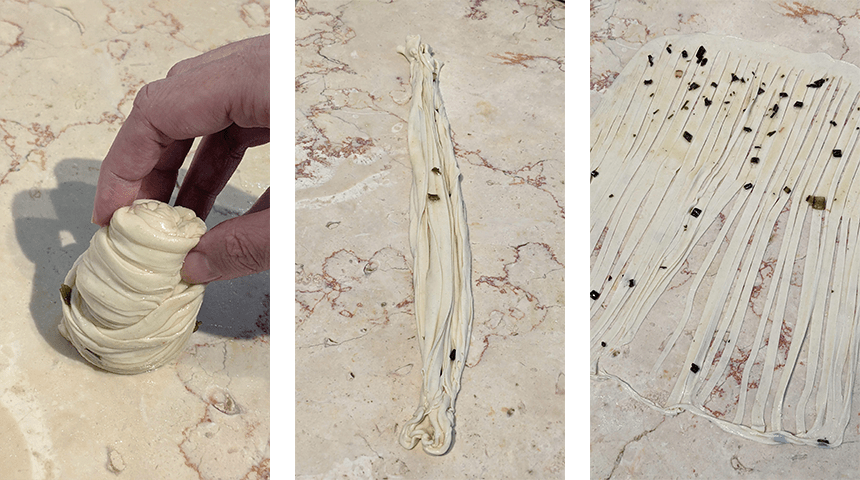 פותחים את הבצק בחזרה למלבן גדול, מצמידים את שולי הבצק בשני הקצוות כך שנוצרת רצועה שמרכזה הוא רצועות בצק דקות. תופסים את הרצועה משני הקצוות ומותחים מעט ובעדינות תוך כדי תפיחה על משטח העבודה. מגלגלים את הרצועה עד למרכזה משני הצדדים, מניחים גליל אחד על השני ומועכים על מנת לאחד מעט בין הגלילים. מניחים בצד ל-10 דקות מנוחה. חוזרים על הפעולות עם יתר חלקי הבצק.