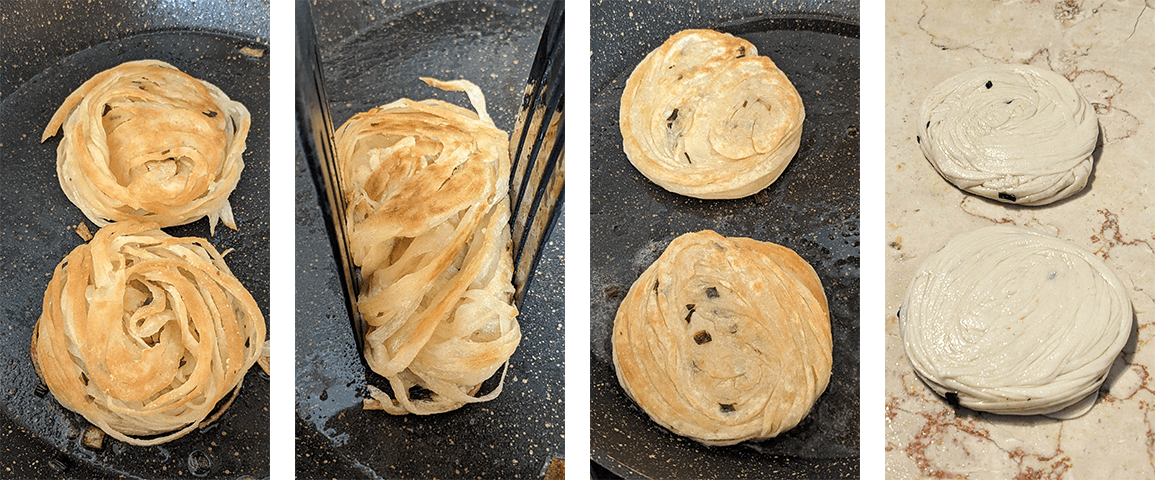 פנקייק בצל ירוק משי – Pán sī bǐng. לחם מחבת מיוחד המגיע ממחוז שאנדונג שבסין. מה שמבדיל בין הפנקייק הזה לפנקייק הבצל הירוק הקלאסי הוא השכבות הדקות של בצק המדמות את קורי המשי של העכביש (מכאן השם). את השכבות יוצרים ע"י חיתוך הבצק לרצועות דקות שאותן מותחים יחד על מנת לדקק אותן אפילו יותר. ההכנה אמנם דורשת זמן אך בסוף מתקבל לחם מחבת פריך מאוד מבחוץ, רך מבפנים ופשוט ממכר. מומלץ להכין כמות כפולה ולהקפיא בקופסה אטומה עם הפרדה של נייר אפייה בין הפנקייקים.