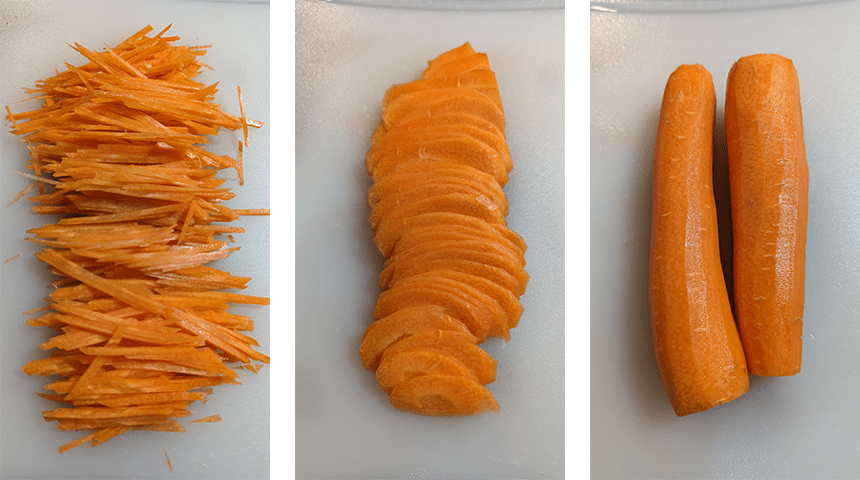שוטפים ומקלפים את הגזר וחותכים לפרוסות אלכסוניות דקות בעובי 1-2 מ"מ. משכיבים את הפרוסות על משטח העבודה בחפיפה כמו קלפים וחותכים לגפרורים.