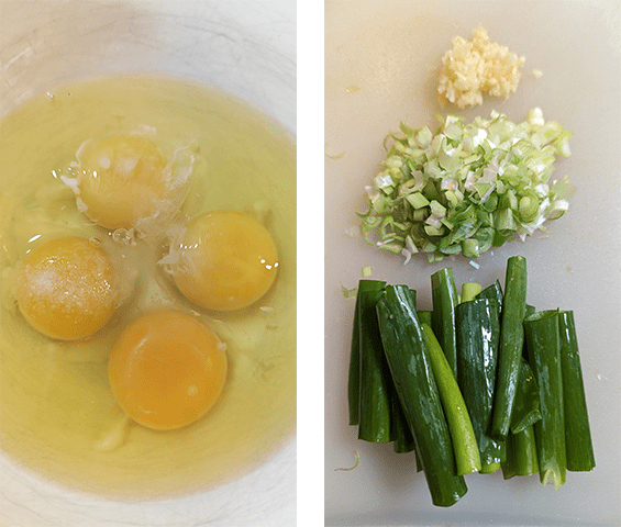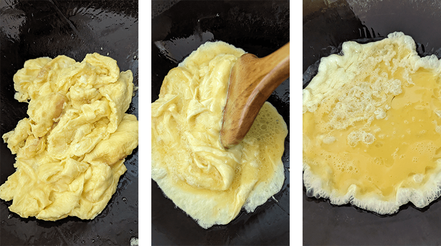 מחממים 3 כפות שמן בווק, מוסיפים את הביצים הטרופות ומטגנים כחצי דקה. מערבבים בעדינות עד שהביצים מוכנות, שוברים את החביתה שהתקבלה לחתיכות גדולות ומוציאים לצלחת.