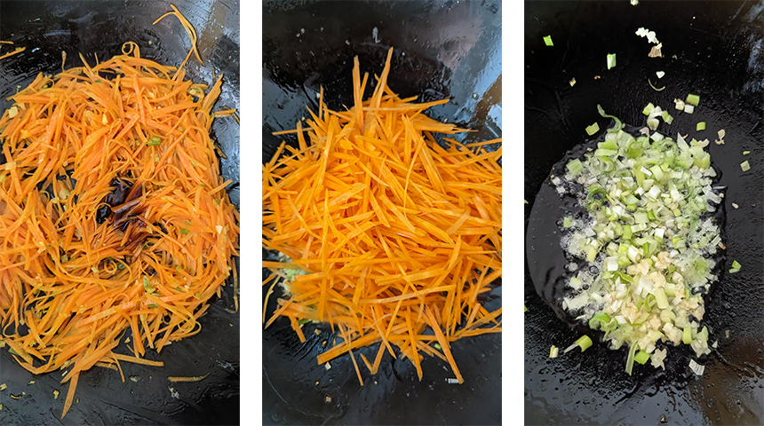 מוסיפים שתי כפות שמן לווק. מוסיפים שום וחלקים לבנים של בצל ירוק, מטגנים חצי דקה ומוסיפים את הגזר. מטגנים תוך כדי ערבוב עד שהגזר מתרכך מעט. מוסיפים רוטב סויה, רוטב צדפות ופלפל לבן ומטגנים תוך כדי ערבוב עוד חצי דקה.