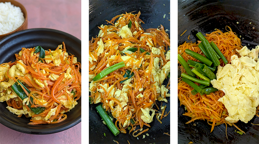גזר מוקפץ עם ביצה – Húluóbo chǎo dàn. מנה סינית ביתית הנפוצה בכל רחבי סין. גזר חתוך לגפרורים מוקפץ עם ביצה ומתובל קלות. מנה מאוד פשוטה להכנה שהולכת נפלא עם אורז לבן מבושל.