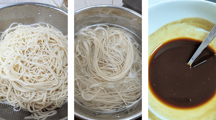 מערבבים את כל מרכיבי הרוטב ומניחים בצד. מבשלים את האטריות לפי הוראות היצרן, מסננים ושוטפים במים קרים.