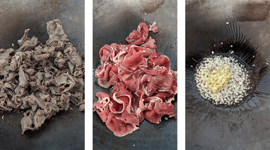 מכינים את המנה – רצוי לחלק את ההכנה לפעמיים על מנת לא לצופף את הווק. מחממים 4 כפות שמן בווק על אש גבוהה, מוסיפים ג'ינג'ר קצוץ ומטגנים חצי דקה. מוסיפים בשר, מתבלים במלח ופלפל, מטגנים עד להשחמה ומוציאים לצלחת.