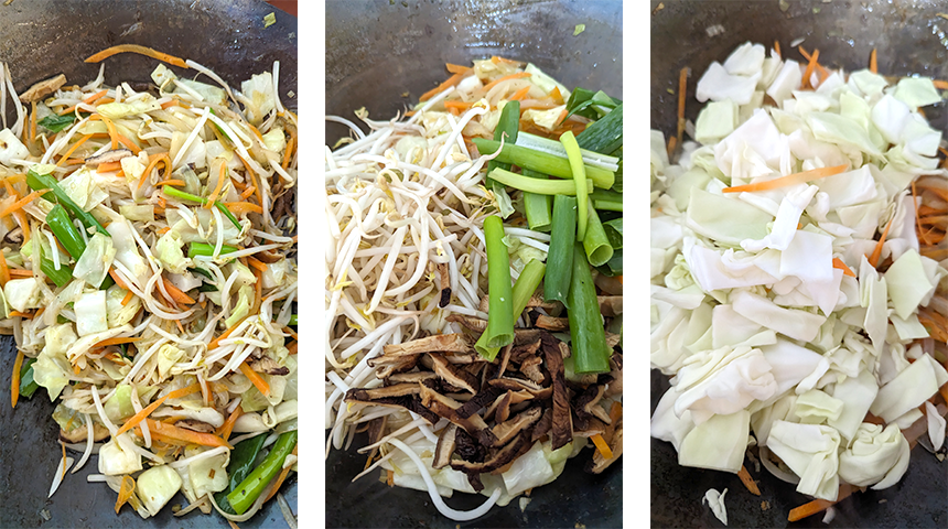מכינים את הירקות – משרים פטריות שיטאקי במים רותחים כ-20 דקות. קוצצים דק שום וג'ינג'ר, חותכים את הכרוב לקוביות בגודל 1×1 ס"מ וחותכים את הגזר לגפרורים דקים. מפרידים בצל ירוק לחלקים לבנים וירוקים, חותכים את החלקים הירוקים למקטעים באורך 5 ס"מ וקוצצים את החלקים הלבנים. שוטפים את הנבטים ופורסים את הבצל לרצועות אורכיות. סוחטים את הפטריות ממי ההשרייה, מסירים את הגבעולים הקשים וחותכים לרצועות.