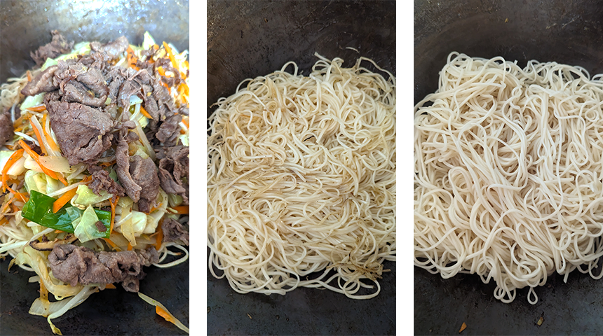 מוסיפים 2 כפות שמן לווק, מחממים ומוסיפים אטריות מבושלות. מטגנים ללא ערבוב עד שהאטריות מזהיבות מלמטה, הופכים ומטגנים גם את הצד השני. מניחים את הירקות והבשר המטוגנים מעל האטריות המטוגנות ומוסיפים רוטב.