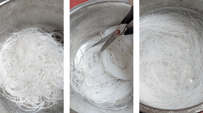 משרים אטריות שעועית במים בטמפרטורת החדר כ-10 דקות לריכוך קל. מסננים וחותכים את האטריות בעזרת מספריים בכמה מקומות על מנת לקצר אותן קצת, מה שיקל על ערבוב הסלט והאכילה שלו.