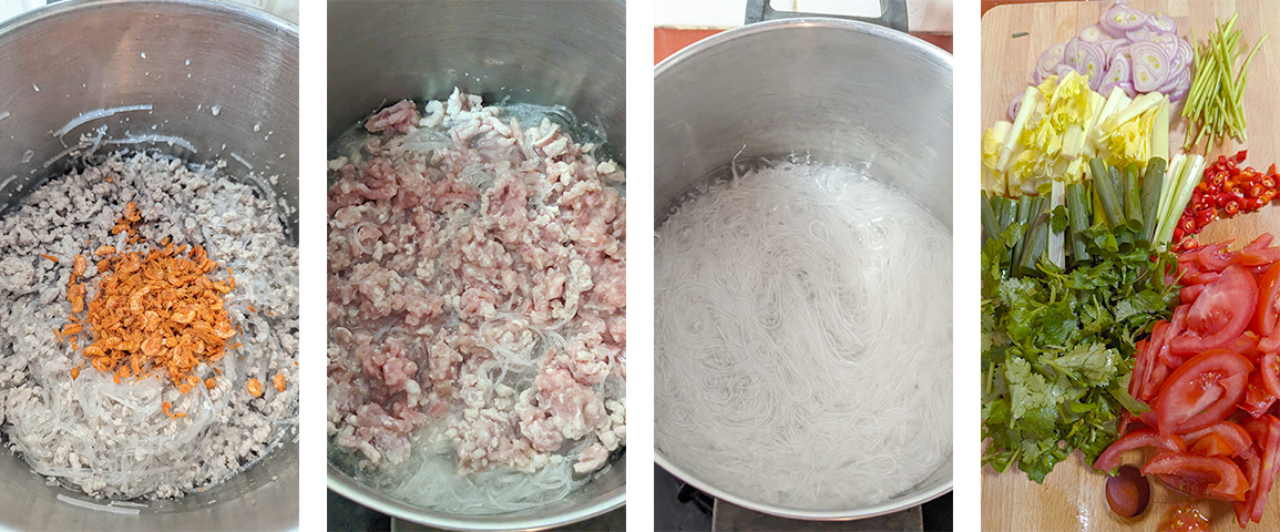 מרתיחים 2 כוסות מים בסיר. מוסיפים את אטריות השעועית, מבשלים כדקה ומוסיפים בשר טחון. מבשלים תוך כדי ערבוב כ-3 דקות עד שהבשר מבושל לחלוטין ורוב המים נספגים. מכבים את האש, מוסיפים שרימפס מיובש ומערבבים.