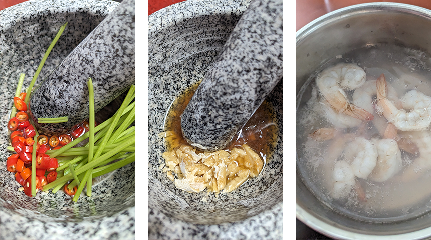 מכינים את הרוטב – קוצצים סוכר דקלים ושמים במכתש ועלי יחד עם רוטב דגים ומיץ ליים. אם הסוכר קשה מדי אפשר להמיס אותו במעט מים רותחים ולהשתמש בסירופ. כותשים היטב עד שהסוכר נמס, מוסיפים צ'ילי וגבעולי כוסברה וכותשים מעט.