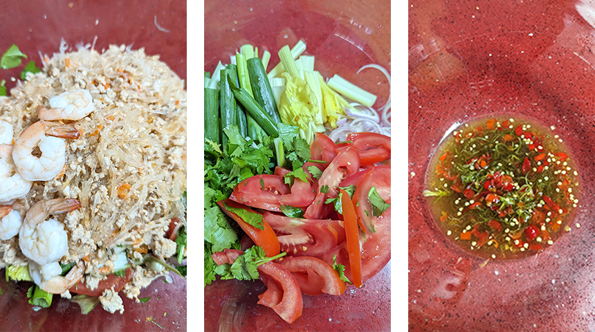 מרכיבים את הסלט – מעבירים את הרוטב לקערה גדולה. מוסיפים שאלוט, עלי כוסברה, בצל ירוק, עגבניה וסלרי ומערבבים. מוסיפים את השרימפס המבושל ואת תערובת האטריות עם הבשר והשרימפס המיובש.