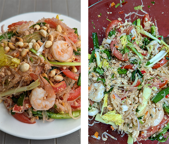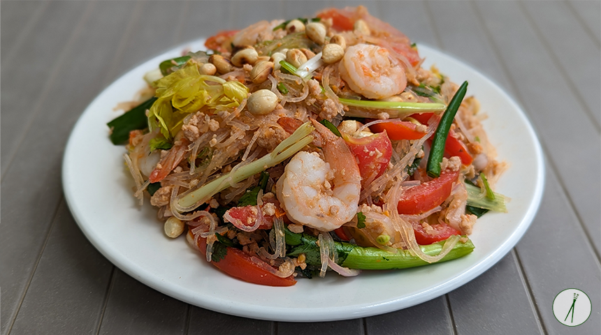 יאם וון סן – Yạm wun sĕn. סלט אטריות שעועית תאילנדי מרענן ועשיר. את הסלט מכינים עם אטריות שעועית הנקראות גם אטריות זכוכית או אטריות צלופן, בתוספת של בשר טחון ופירות ים. לרוב משתמשים בשרימפס גדולים אך בהחלט אפשר להשתמש בתערובת פירות ים. אמנם רשימת המרכיבים נראית ארוכה אך ההכנה קלה ומהירה ובסופה מתקבל סלט רענן ומשביע שמגישים קר או בטמפרטורת החדר. מעולה לימי הקיץ החמים.