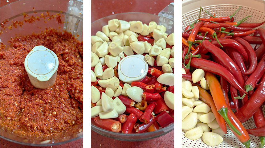 שוטפים היטב את שני סוגי הצ'ילי, מייבשים בעזרת נייר סופג, נפטרים מהעוקצים ופורסים לפרוסות גדולות. מקלפים את השום ומכניסים לקערת מעבד מזון יחד עם פרוסות הצ'ילי. מפעילים את מעבד המזון וטוחנים לתערובת דקה.