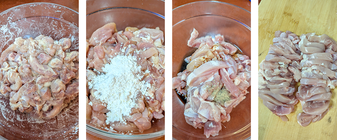 מכינים את העוף – חותכים את הפרגיות לרצועות בעובי 1 ס"מ ובאורך 3 ס"מ. מניחים בקערה ומוסיפים מלח, פלפל לבן, יין בישול ורוטב סויה ומערבבים היטב עד שכל הנוזלים נספגים בבשר. מוסיפים קמח תפוחי אדמה ומערבבים היטב. מוסיפים שמן, מערבבים ומניחים בצד. מטרת השמן היא למנוע מחתיכות העוף להידבק אחת לשניה.