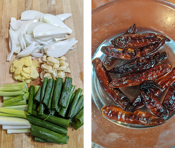מכינים את הירקות – משרים צ'ילי יבש במים חמים ל-10 דקות. חוצים בצל לבן לשניים ופורסים כל חצי לפרוסות אורכיות דקות. פורסים שום, מקלפים את הג'ינג'ר, פורסים לפרוסות וחוצים אותן ל-2. מפרידים את הבצל הירוק לחלקים לבנים וירוקים וחותכים למקטעים באורך 5 ס"מ.