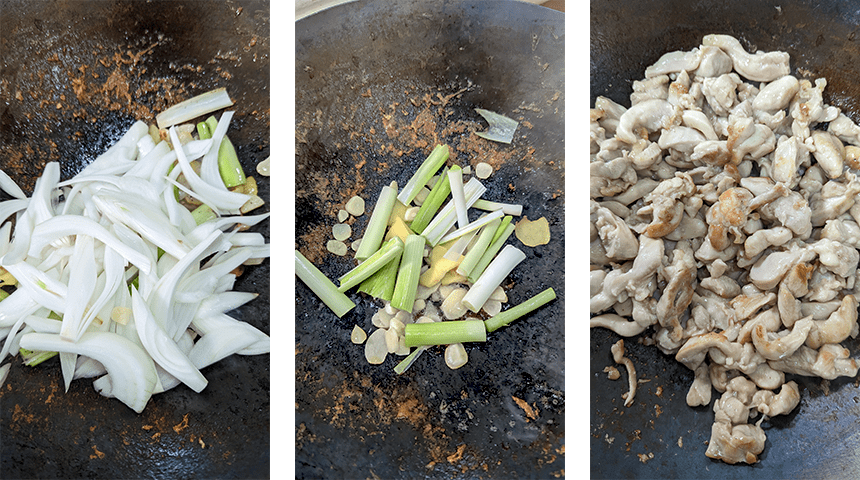 מכינים את המנה – מחממים שתי כפות שמן בווק על אש גבוהה. מוסיפים את העוף המושרה, מטגנים עד להזהבה מכל הצדדים (העוף צריך להיות כ-80% עשוי) ומוציאים לצלחת.