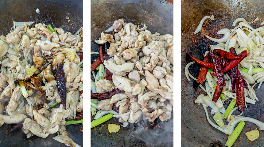 סוחטים את הצ'ילי ממי ההשרייה ומוסיפים לווק. מחזירים את העוף ומערבבים. מוסיפים סויה כהה, רוטב צדפות, רוטב סויה וסוכר ומערבבים לאיחוד.