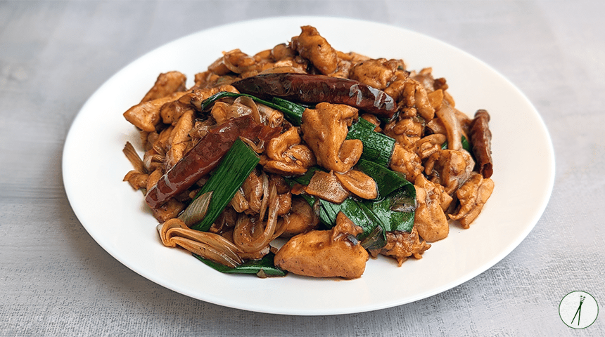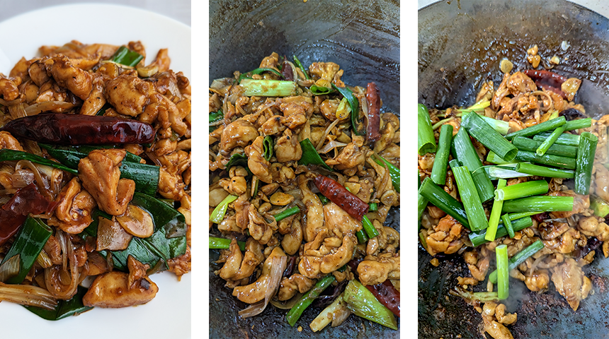 עוף מוקפץ עם בצל ברוטב צדפות – Yángcōng háoyóu chǎo jī. מנה קנטונזית, המגיעה ממחוז גואנגדונג בדרום סין. מנה פשוטה להכנה, ארומטית ובעלת רוטב פיקנטי-מתקתק עשיר בטעמים. ישנן מספר גרסאות למנה שההבדל המרכזי ביניהן הוא בתוספת של ירקות שונים (פלפל, גזר או פטריות) וברמת החריפות המשתנה בהתאם לכמות הצ'ילי שמוסיפים לרוטב. מומלץ להגיש לצד אורז לבן מבושל שיספח אליו את כל הטעמים.