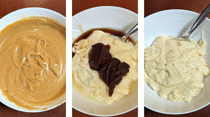 מכינים מיונז – בכלי גבוה שמים שמן, חלמונים, חומץ אורז, סוכר, חרדל ומלח. מכניסים בלנדר מוט, מצמידים לקרקעית הכלי ומפעילים עד שנוצר מיונז לבנבן בתחתית הכלי. מתחילים להעלות את המוט באיטיות ובתנועות סיבוביות עד שנוצר מיונז אחיד וכל השמן נטמע בתוכו. מעבירים את המיונז לקערה קטנה, מוסיפים גוצ'וג'אנג, מיץ לימון ומייפל ומערבבים היטב לאיחוד בעזרת מטרפה.