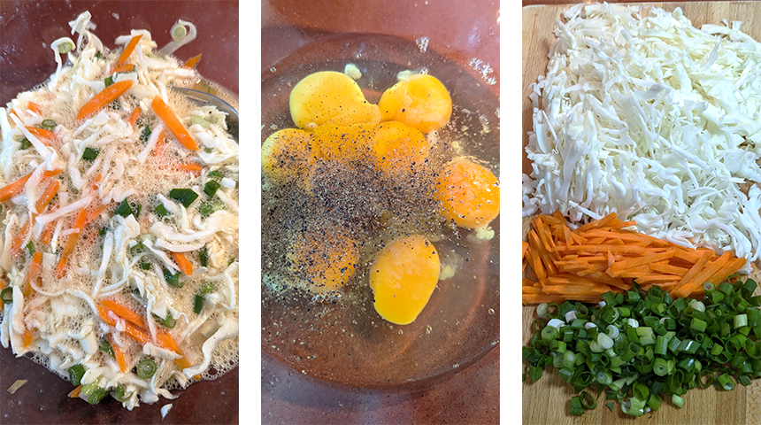 מכינים את החביתה – פורסים כרוב לרצועות דקיקות, חותכים גזר לגפרורים וקוצצים בצל ירוק. בקערה גדולה טורפים ביצים ומתבלים במלח ופלפל שחור גרוס, מוסיפים את הירקות ומערבבים היטב.