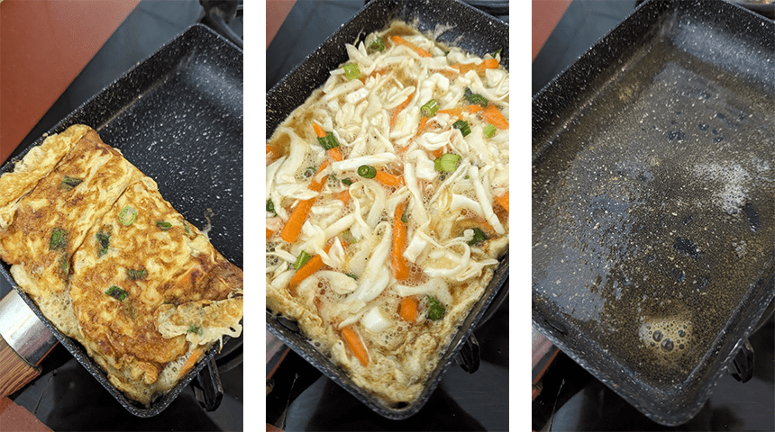 ממיסים חמאה במחבת מרובעת על אש בינונית (למי שאין אפשר גם במחבת עגולה רגילה), מוסיפים את תערובת הביצים והירקות ומטגנים עד שהביצים מתייצבות קלות ותחתית החביתה שחומה, מקפלים את החביתה לשניים וממשיכים לטגן משני הצדדים לסירוגין עד שהחביתה עשויה לחלוטין מבפנים ומוציאים לצלחת.