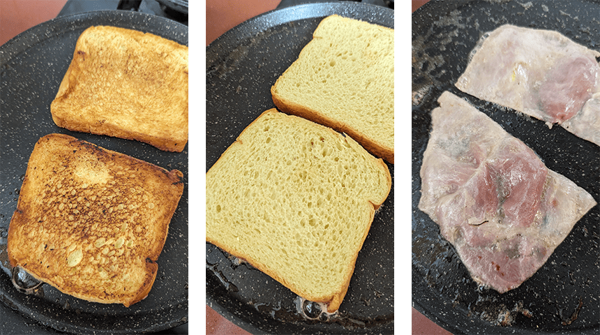 מכינים את הטוסט – מחממים מעט שמן במחבת, מוסיפים פרוסות האם, מטגנים עד להזהבה ומוציאים לצלחת. מורחים את פרוסות הלחם בחמאה משני צידי הפרוסות, ממיסים מעט חמאה במחבת ומטגנים את הפרוסות משני הצדדים, מוציאים לצלחת.