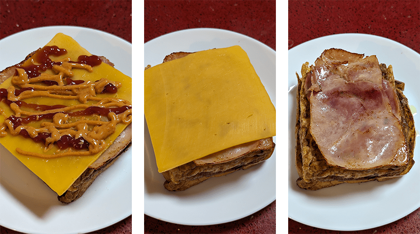 מניחים חביתה על פרוסת לחם קלוי, מפזרים כפית סוכר על החביתה ומניחים האם ופרוסת גבינת צ'דר.