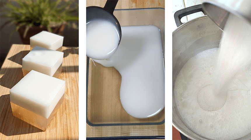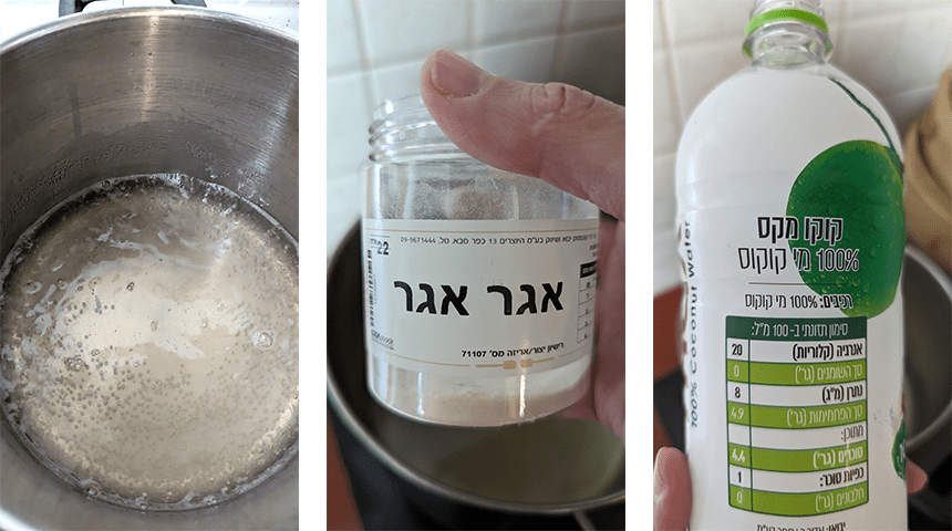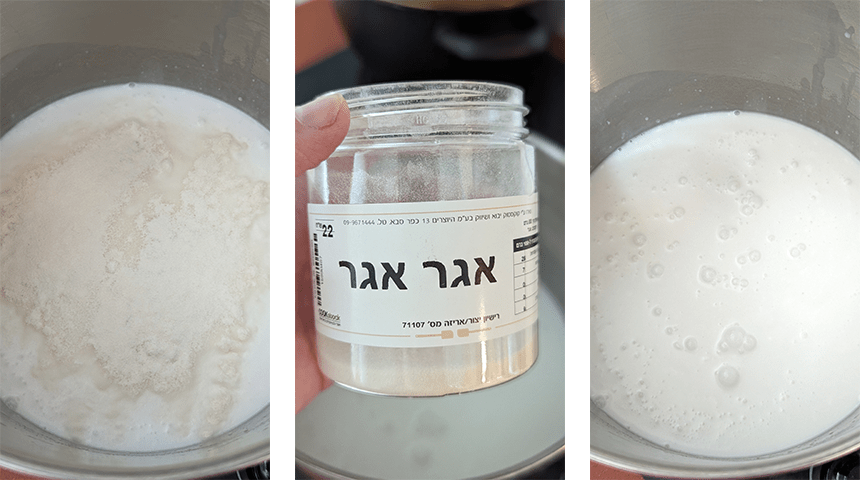 מכינים את השכבה השקופה – שמים בסיר מיי קוקוס, מפזרים על פניו אגר אגר ומשהים כ-5 דקות לריכוך קל. מניחים את הסיר על אש בינונית ומערבבים עד לסף רתיחה.