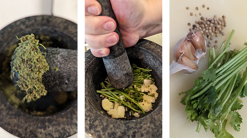 מכינים את המרכיבים עבור המלית – במכתש ועלי מניחים גבעולי כוסברה, שום, פלפל לבן שלם ופלפל שחור שלם. כותשים עד לקבלת משחה אחידה.