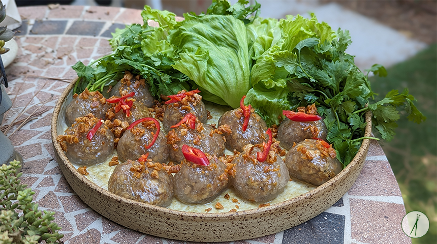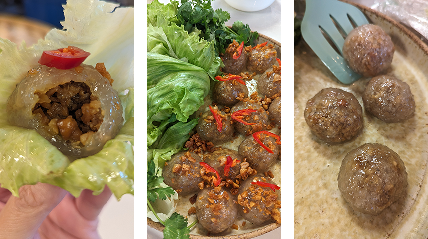 סאקו סאיי מו – Saku Sai Moo. כיסוני טפיוקה במילוי בשר תאילנדיים. אוכל רחוב פופולרי ברחבי תאילנד, מלית עשירה ומתקתקה של בשר עטופה במעטפת עדינה, שקופה ודביקה של כדורי טפיוקה. את הכדורים מלווים עלים טריים של חסה וכוסברה ופלפלוני צ'ילי תאילנדי חריפים המהווים ניגוד למתיקות של המילוי ויחד יוצרים ביס עם איזון טעמים מושלם. דרך ההכנה ארוכה ומעט מורכבת אך התוצאה לחלוטין שווה את זה.