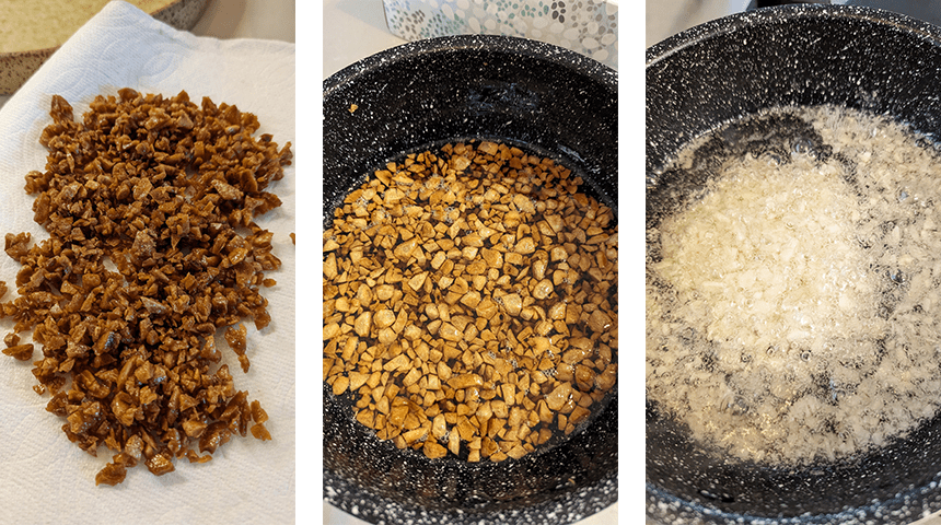 מכינים שום מטוגן – קוצצים גס את השום. בסיר קטן על אש בינונית-נמוכה מחממים שמן לחום של 130-150 מעלות (חם אך לא רותח), מוסיפים את השום הקצוץ ומטגנים באיטיות עד שהשום שחום ופריך, בזהירות שלא יישרף. מסננים את השום החוצה לצלחת מרופדת בנייר סופג ושומרים את שמן השום שנוצר לנו בצד.