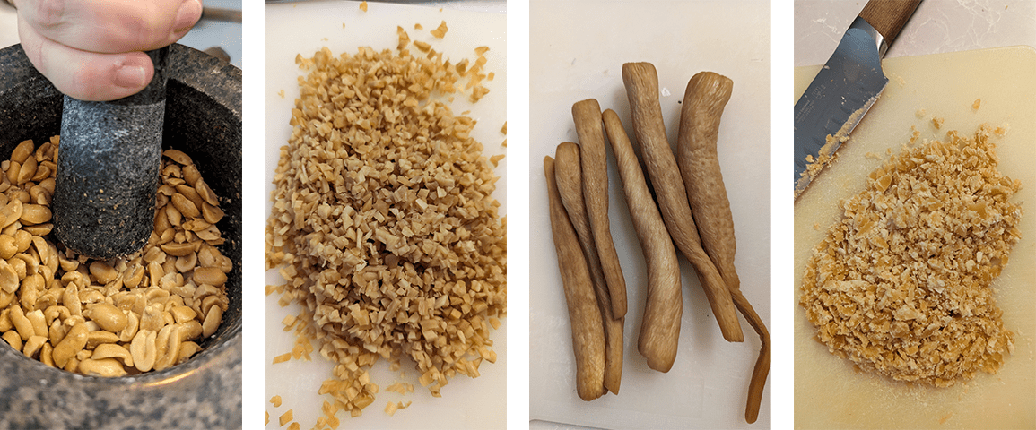 קוצצים דק בצלצלי שאלוט, קוצצים או מגררים סוכר דקלים, קוצצים גס בוטנים קלויים וחותכים דייקון כבוש מתוק לקוביות קטנטנות.