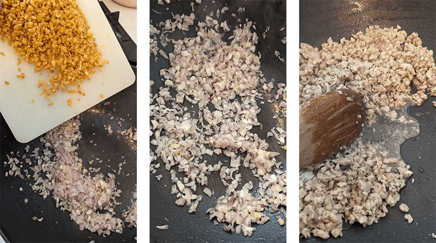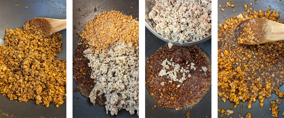 מכינים את המלית – מחממים ווק על אש גבוהה ומוסיפים 3-4 כפות משמן השום שהכנו. מוסיפים את משחת התבלינים ומטגנים מעט לפתיחת הטעמים. מוסיפים בשר טחון ומטגנים תוך כדי פירוק הבשר לפירורים עד שהוא משנה את צבעו, לא צריך לייבש את הנוזלים. מתבלים ברוטב סויה ומוציאים לצלחת.