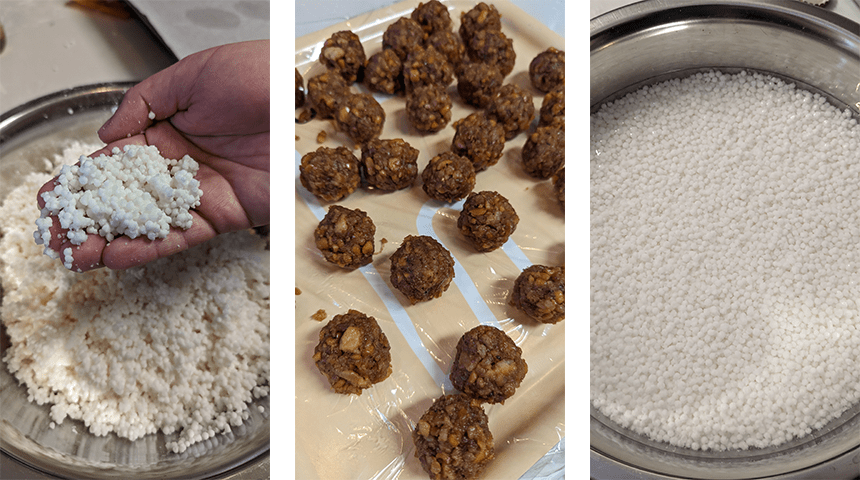 מכינים את הסאקו סאיי – מסננים את הטפיוקה מעודפי המים. לוקחים כמות של כף מתערובת הבשר, מאחדים לכדור הדוק תוך כדי מעיכה ומניחים על מגש מרופד בנייר אפייה. חוזרים על הכנת הכדורים עד שהתערובת נגמרת. לוקחים כף מהטפיוקה ומשטחים על כף היד, מניחים כדור בשר במרכז ועוטפים אותו בכדורי הטפיוקה הדביקים מכל הצדדים כך שלא ישארו חורים בציפוי.