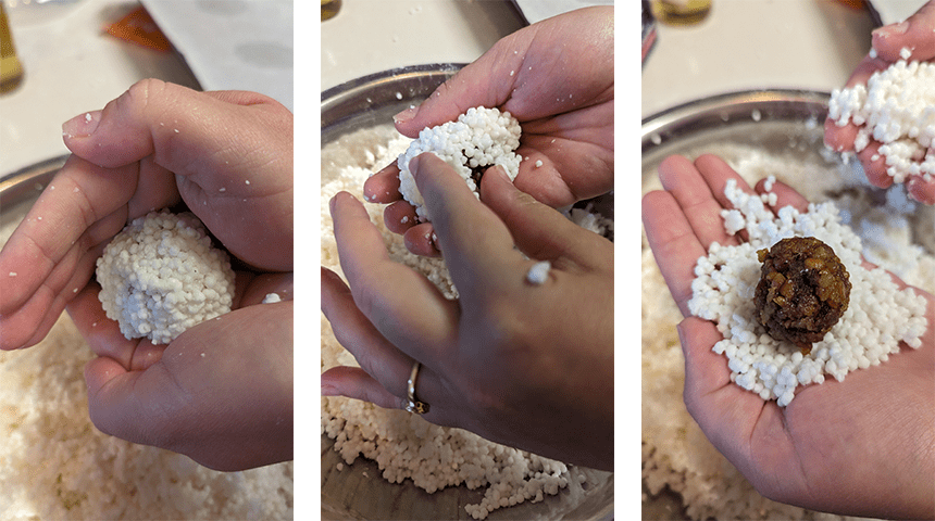 אם חסר ניתן להוסיף מעט טפיוקה ואם מרגישים שהציפוי עבה מידי, מסירים מעט מהציפוי ומעגלים לכדור מהודק. יש לזכור שהטפיוקה אינה נדבקת לבשר, אלה לעצמה. מניחים בחזרה את הכדור על המגש המרופד. חוזרים על הפעולות עם שאר הטפיוקה וכדורי הבשר, שומרים על מרווחים בין הכדורים על מנת שלא ידבקו אחד לשני.