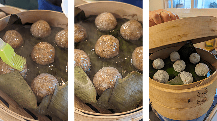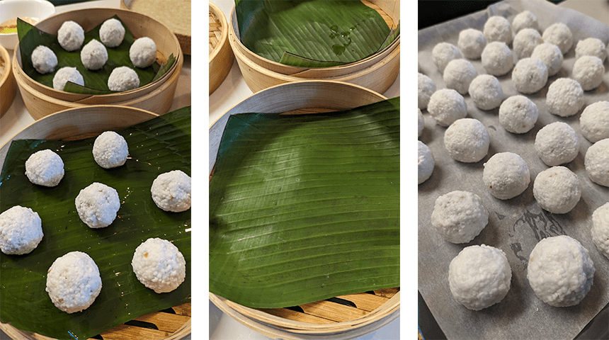 מאדים את הכדורים – מרפדים סלסלת אידוי בעלה בננה. מחוררים מעט את העלים ומשמנים בנדיבות בשמן שום. מניחים את הכדורים במרווחים של כ-5 ס"מ בין אחד לשני על עלה הבננה. אם אין עלי בננה אפשר לרפד את סלסלת האידוי בעלי כרוב באותו האופן.