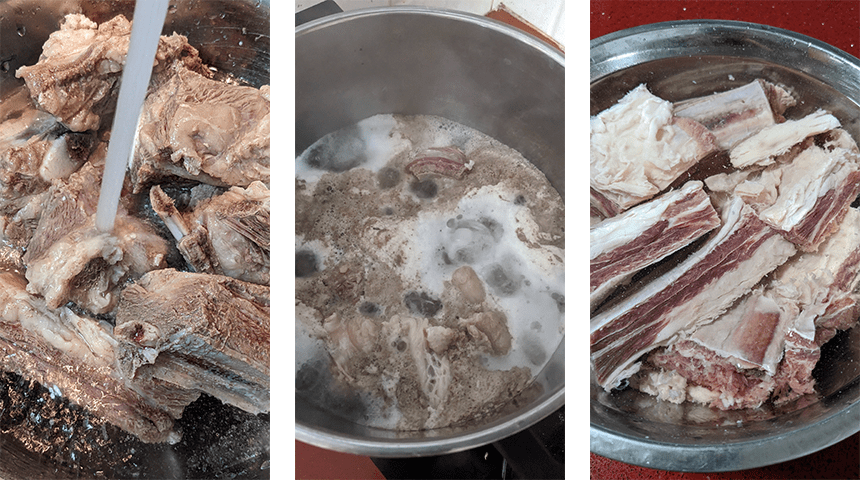 מכינים את הבשר לבישול – מסננים את הצלעות ממי ההשרייה ומעבירים לסיר. מכסים במים בטמפרטורת החדר ומביאים לרתיחה. מסננים ושוטפים היטב תחת זרם מים קרים, שמים דגש על קצוות העצמות החתוכות.