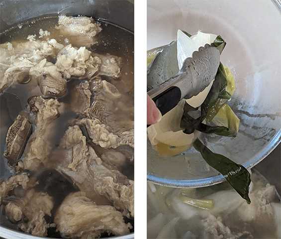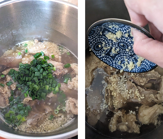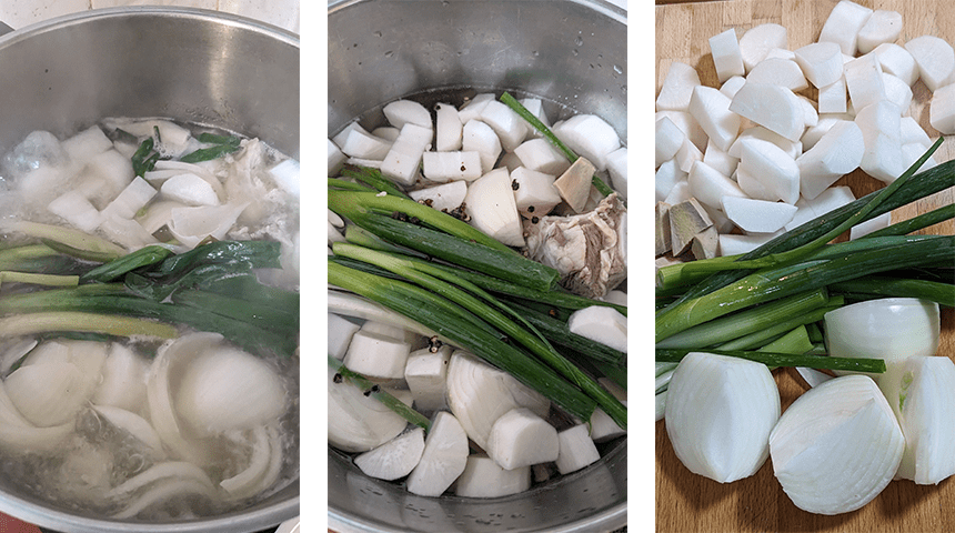 מכינים את המרק – בסיר נקי מניחים את הצלעות השטופות יחד עם דייקון, בצל לבן, ג'ינג'ר, חצאי בצל ירוק, פלפל שחור ומים. מביאים לרתיחה ומסירים את הקצף שמצטבר על פני המרק.
