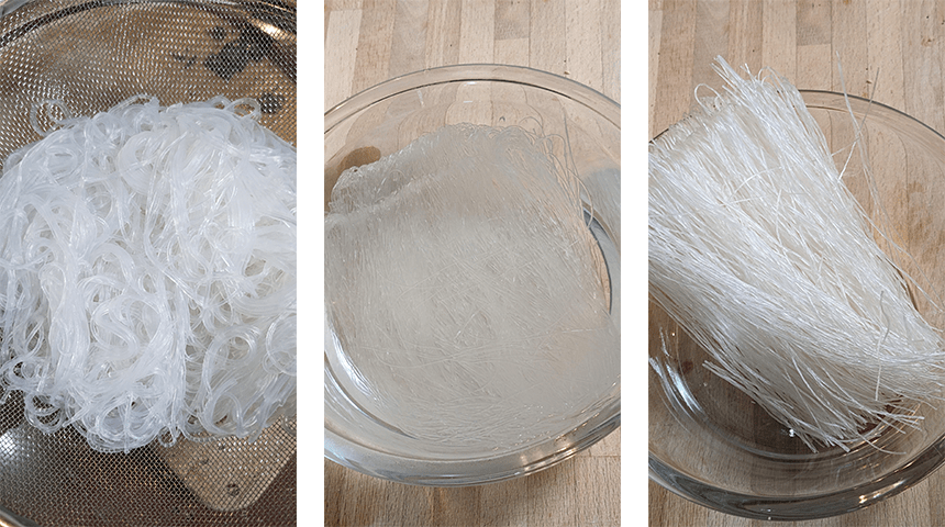 בינתיים משרים אטריות אורז במים חמים עד שהן מתרככות, מסננים ומניחים בצד.