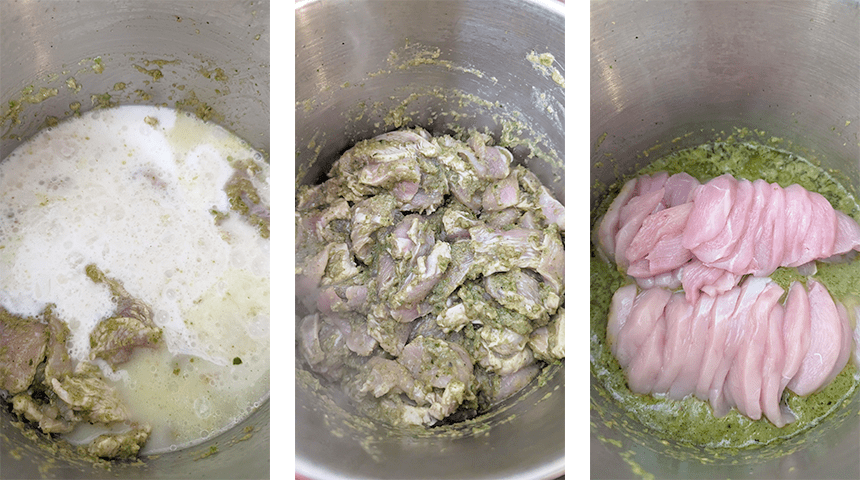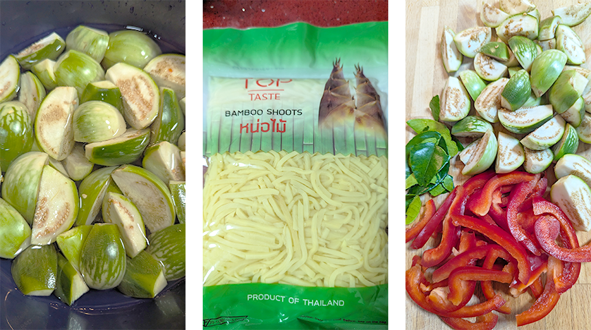 מכינים את המרכיבים לבישול – מעבירים את רצועות נצרי הבמבוק לקערה ושוטפים היטב מנוזלי השימור, מכסים במים חמים ומניחים בצד. חותכים את חזה העוף לרצועות בעובי 1 ס"מ. מסירים את הגבעול המרכזי הקשה מעלי הקפיר ליים ושוטפים את עלי הבזיל התאילנדי. חותכים את החצילים לרבעים ומניחים בקערה מלאה במים על מנת למנוע השחרה. חותכים את הפלפל האדום לרצועות דקות.
