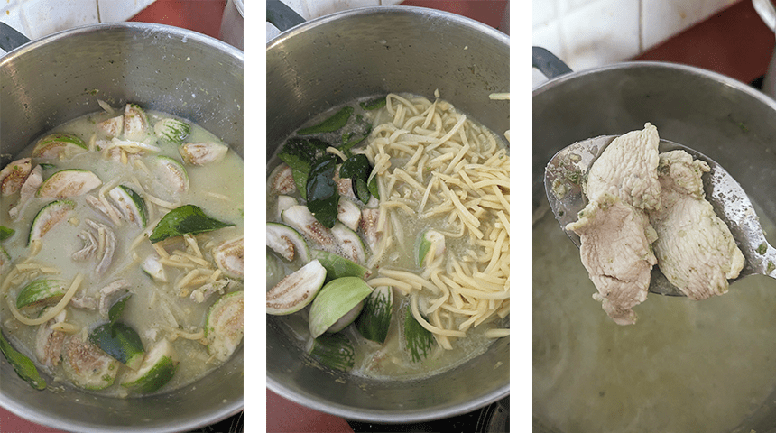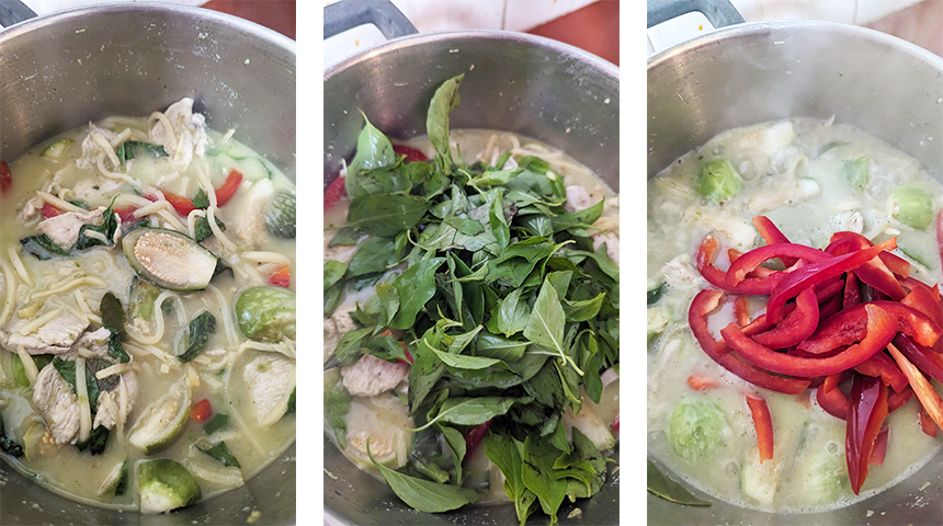 מוסיפים עוף, מערבבים מעט ומוסיפים ציר עוף ואת שארית קרם הקוקוס.