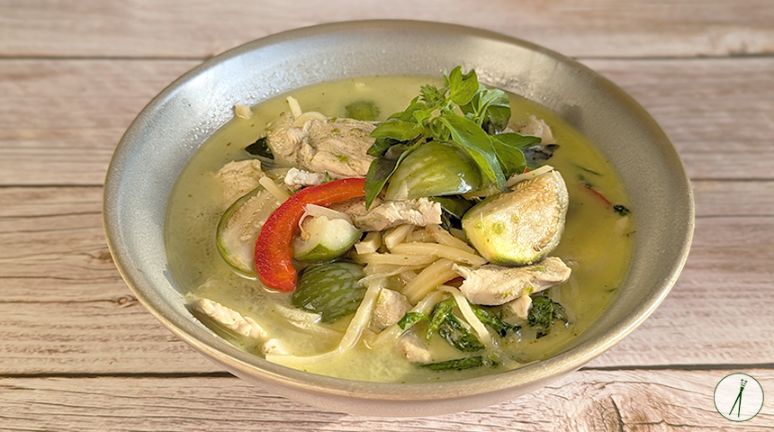 קארי ירוק עם עוף – Gaeng Keow Wan Gai. מנה תאילנדית מוכרת ואהובה של קארי ירוק ארומטי וחריף עם רצועות עוף וחציל תאילנדי. במנה זו השתמשתי במשחת קארי ירוק שהכנתי לבד אך גם עם משחת קארי קנויה היא תצא מצויין. אפשר לווסת את מידת החריפות של המנה ע"י הורדה או הוספה של מחית קארי לפי טעמכם, הכמות שבמתכון מתאימה לרמת חריפות בינונית.