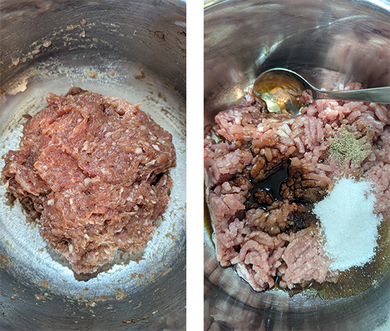 מניחים את הבשר הטחון בקערה. מוסיפים רוטב סויה, יין בישול סיני, סויה כהה, פלפל לבן, רוטב צדפות, רוטב דגים וסוכר ומערבבים נמרצות עד לקבלת עיסה אחידה ודביקה ללא פירורים ברורים של בשר. מכסים בניילון נצמד ומכניסים למקרר למשך 3 שעות לפחות, רצוי למשך הלילה.