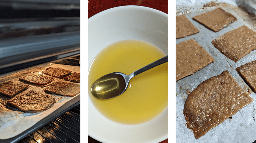 מברישים את החלקים בנדיבות עם מי הדבש ומחזירים לתנור לדקה או שתיים נוספות. הופכים את החלקים, מברישים גם את הצד השני במי הדבש ואופים דקה או שתיים נוספות עד להשחמה.