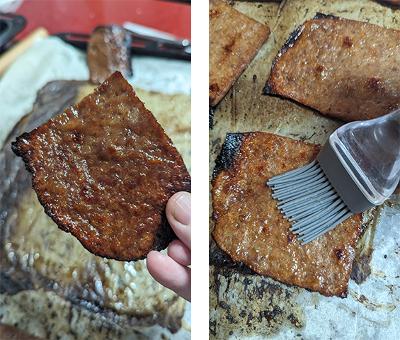 מוציאים מהתנור ומניחים על רשת לצינון מוחלט. במהלך הצינון פרוסות הבשר יאבדו מעט מגמישותן ויהפכו לצמיגיות. מכינים באותו האופן את מחצית הבשר הנותרת. שומרים בקופסא אטומה בטמפרטורת החדר כ-3 ימים או עד חודש במקרר.