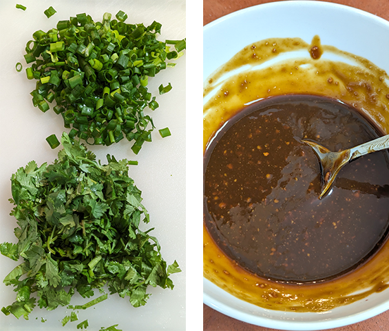 קוצצים דק את הבצל הירוק ואת הכוסברה ומניחים בצד. מניחים את הביצים ואת השומשום השחור בהישג יד קרוב לכיריים.